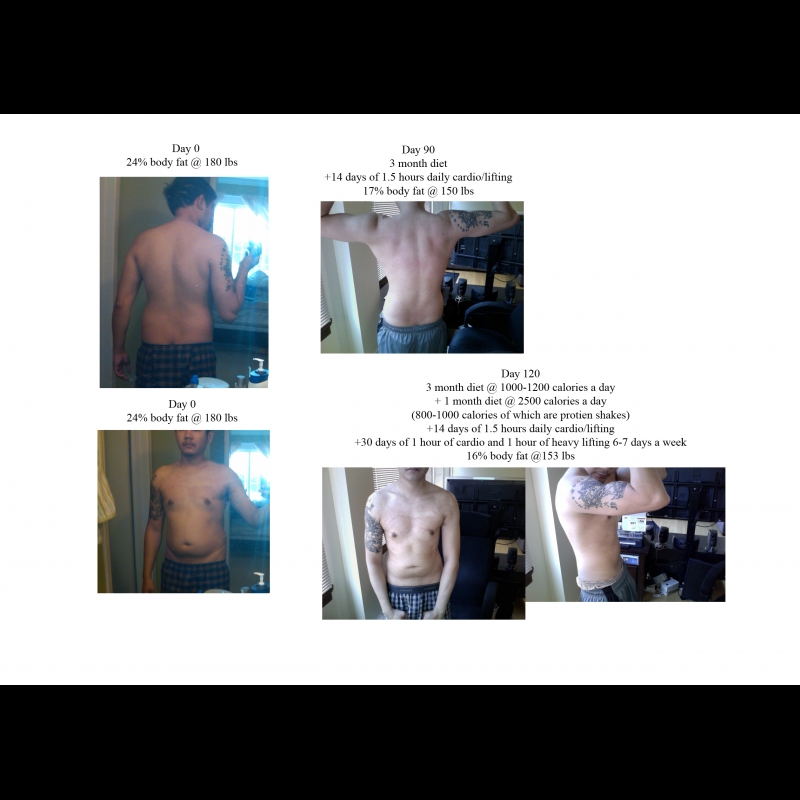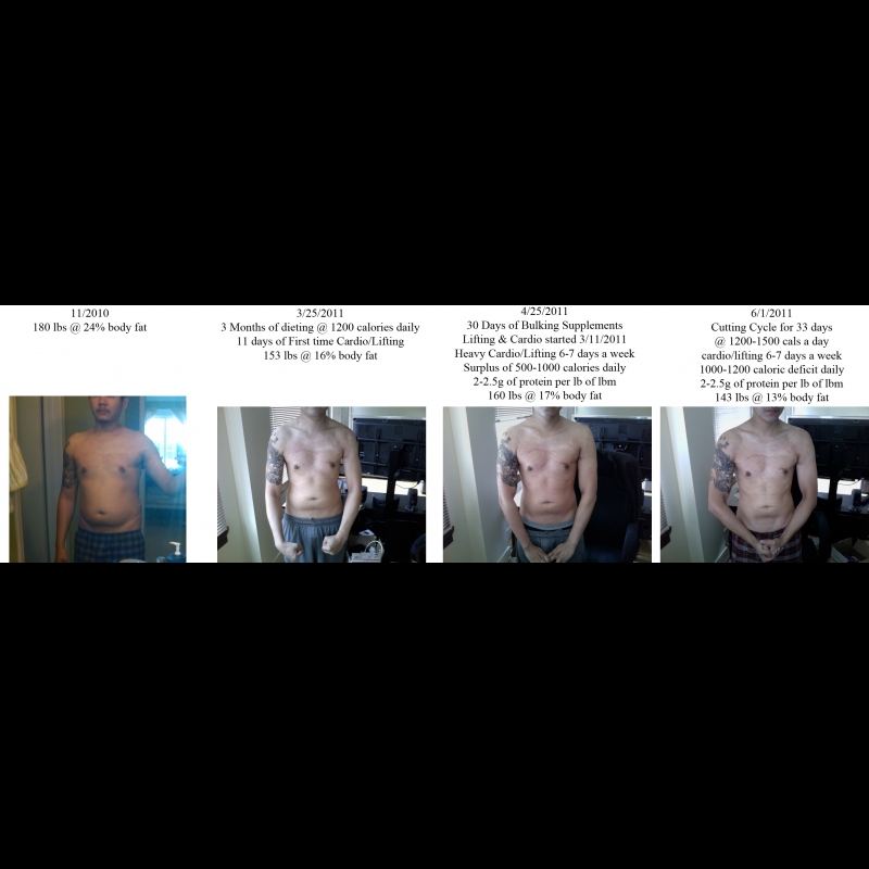 Diet- I eat every 2-3 hours with a daily caloric intake ranging from 3,000 to 3,500 a day. I also make sure I take in at least 200g of protein every day. It is very hard to intake this many calories daily, so I do indulge in fast food nowadays to meet this requirement. It's just a supplement to my current healthy diet.
